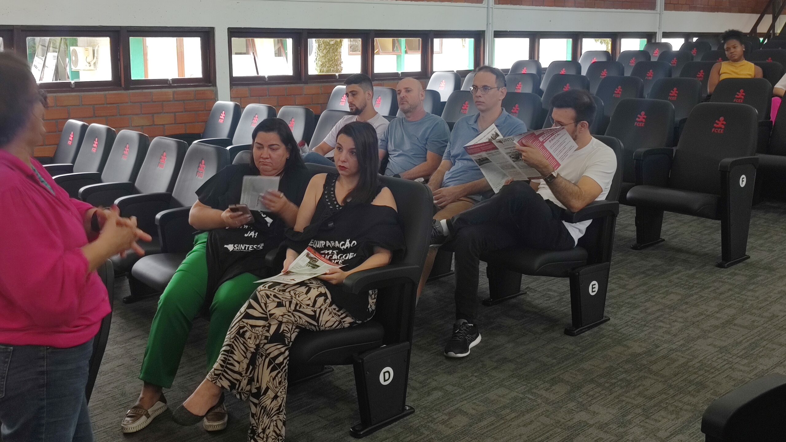 Em reunião na quinta-feira (11) com servidores do quadro civil da FCEE, a presidenta do SINTESPE, Marlete Gonzaga, afirmou que a equiparação das gratificações entre servidores de mesmo cargo em diferentes órgãos do Estado é “prioridade das prioridades”. Acompanhada das secretárias Marileia Gomes, Marilene Pereira e Claudete Gehrard, ela apresentou a camiseta da campanha do Sindicato que visa reivindicar a segunda gratificação e denunciar a discriminação sofrida por nove mil servidores nos diversos órgãos públicos estaduais.