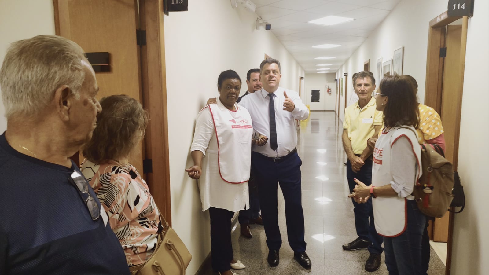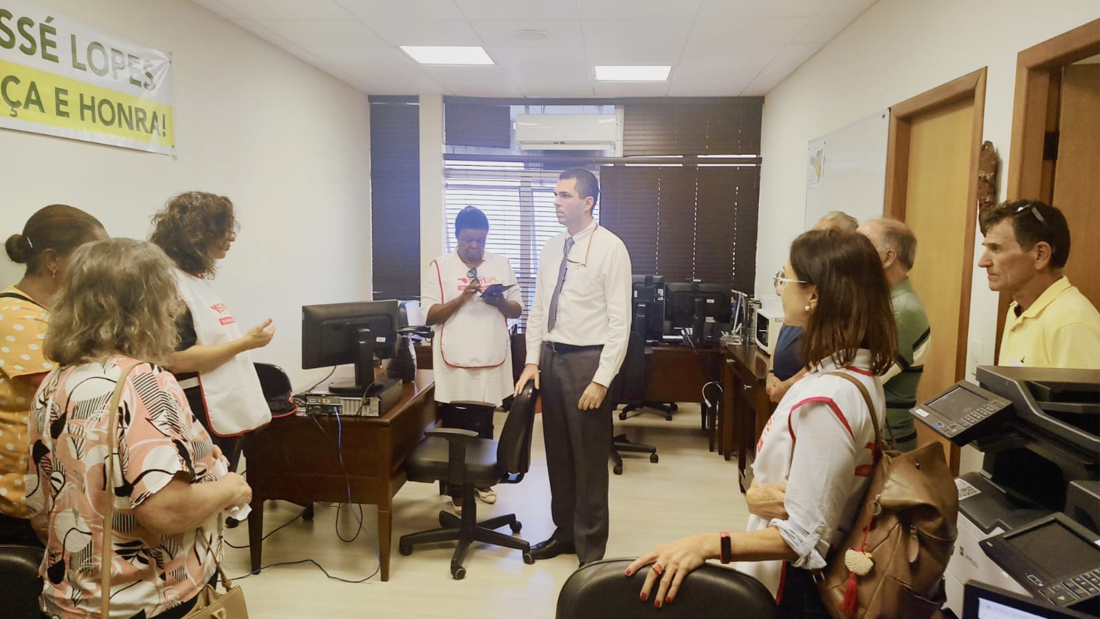 Em visita a gabinetes, a comissão formada pelas dirigentes do Sintespe Marileia Gomes e Sayonara Araujo Pessoa e aposentados Antônio Bilesimo (SED), Brenda Burigo (SED), Célia da Silva (SES), Francisco Maximiano (SIE), Maria da Graça Bittencourt (SES) e Paulo Farias (SIE) foi atendida pelos assessores dos deputados Jessé Lopes (PL) e de Thiago Zilli (MDB), que afirmaram a contrariedade dos parlamentares ao confisco e se comprometeram a repassar informações sobre o PLC 004/2023 – referente à revogação do confisco –, sobre o PLIP de mesmo teor, bem como a reinvindicação pelo cumprimento da data-base pelo governo.