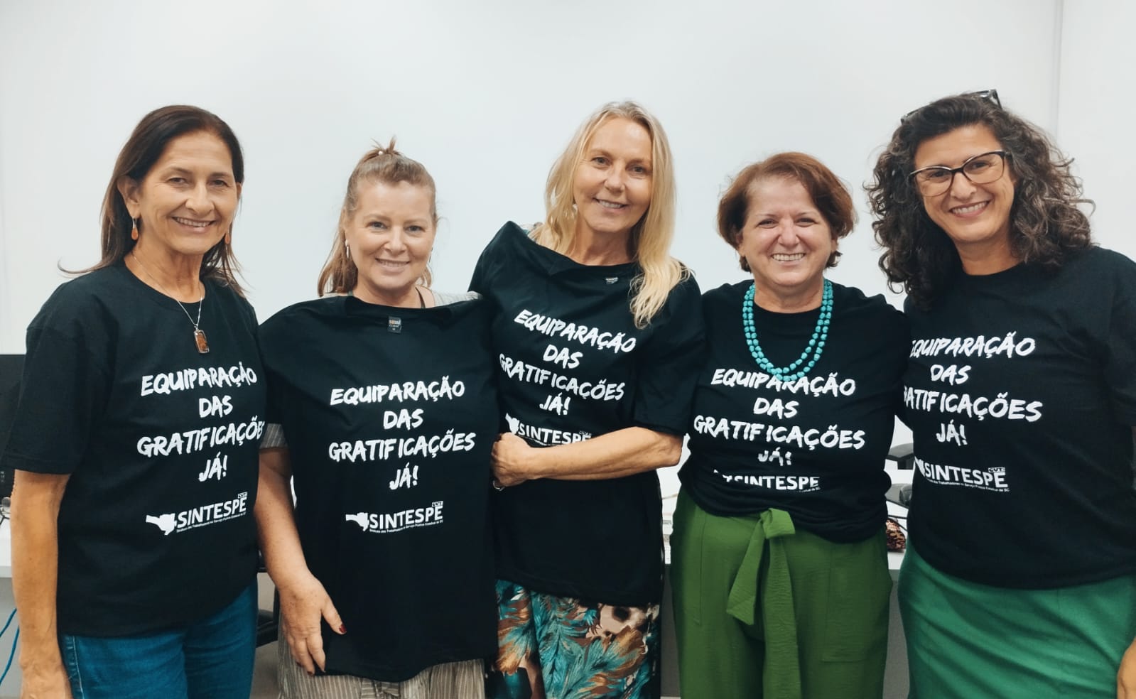Para ampliar a campanha pela EQUIPARAÇÃO DAS GRATIFICAÇÕES nas diferentes categorias do Estado, o SINTESPE confeccionou e está distribuindo camisetas com o slogan ” Equiparação das Gratificações Já” para os servidores dos órgãos que não possuem a 2ª gratificação, como: Aresc, FCC, FCEE, Fesporte, Imetro, SDE, Santur, SAS, SAR, SED, Sicos e SSP.