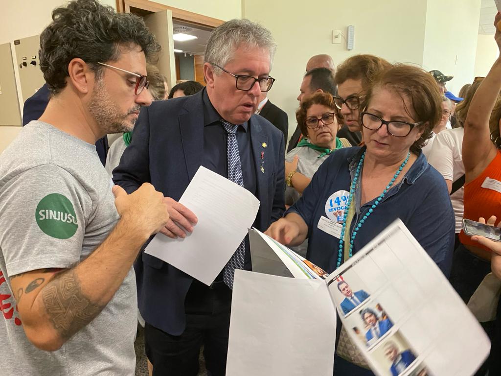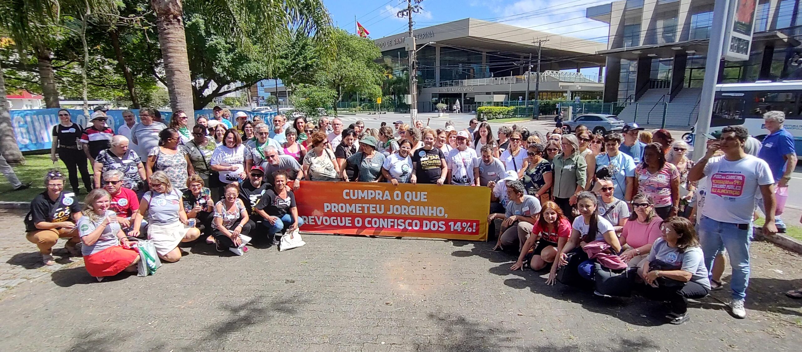 O Ato Público realizado nesta terça (12) na Assembleia Legislativa de SC mostrou a força dos servidores e servidoras na luta em defesa da aposentadoria digna. A atividade organizada pelo Fórum Catarinense em Defesa do Serviço Público contou com a presença de companheiros vindos de diferentes regiões do Estado que se dividiram em grupos para visitar diversos gabinetes de deputados estaduais. Além de conversar com os parlamentares sobre as dificuldades enfrentadas pela maioria dos aposentados e pensionistas, os manifestantes saíram da Assembleia com o compromisso da realização de uma AUDIÊNCIA PÚBLICA nesta quinta-feira (14) com objetivo de debater os projetos de lei referentes ao confisco de 14% das aposentadorias e pensões, que tramitam na Alesc.